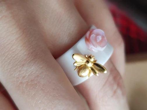 Just a stunning ring made of ceramics! Exactly as in the seller's photo. Chose size 7 and it is small on the index finger, it is better to take a little more. Silver bee covered with gold plating. Rose from the shell. Elements are fixed firmly. Comes in a branded box, as a gift a napkin for the care of the product, a card-business card store and a bookmark. The gift is just super! Very satisfied!